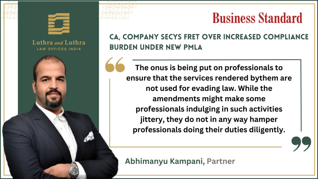 Partner, Abhimanyu Kampani recently shared his insights with the Business Standard over the increased compliance under new Prevention of Money Laundering Act (PMLA) provisions.