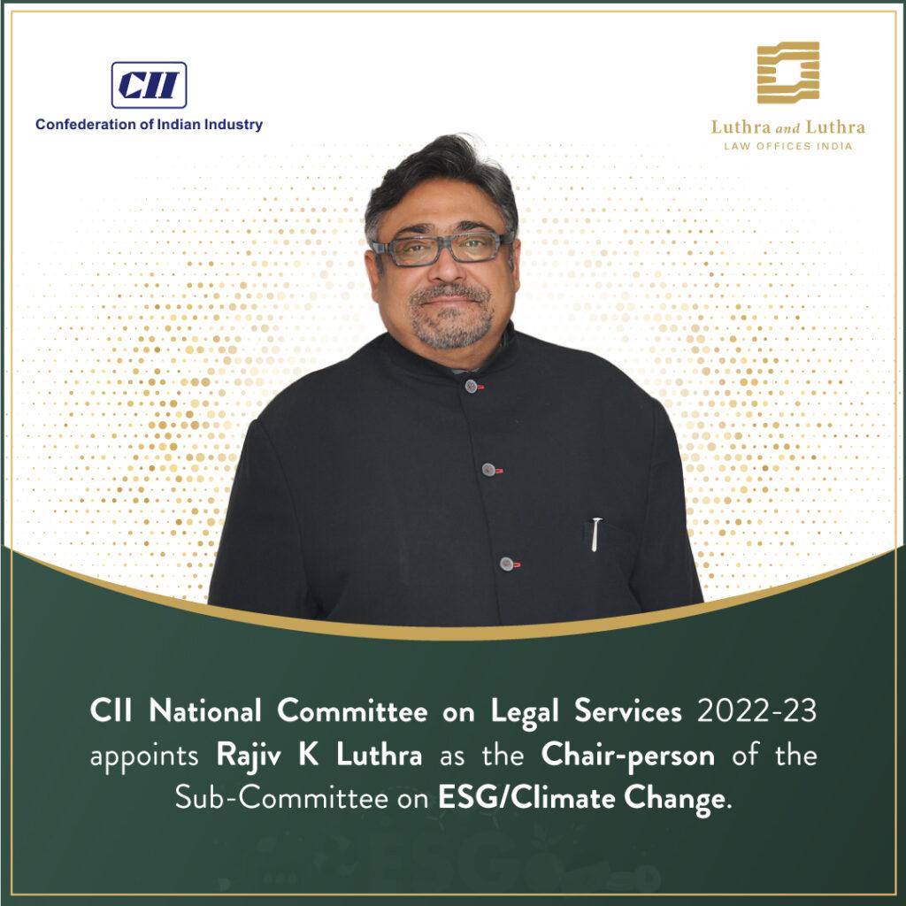 Our Founder & Managing Partner, Rajiv K Luthra, has been appointed as the Chair of the Sub-Committee on ESG/Climate Change by the Confederation of Indian Industry (CII).The Sub-Committee will focus on specific issues, under the overall ambit of the CII National Committee on Legal Services.