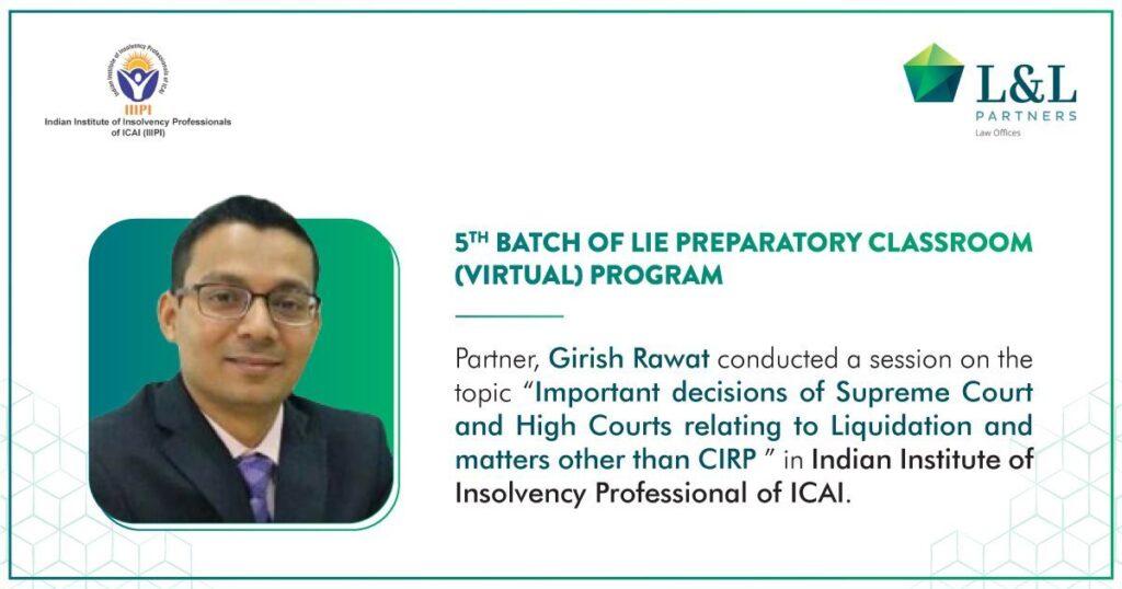 Partner, Girish Rawat was recently invited by the Indian Institute of Insolvency Professionals of ICAI as a Guest Faculty for the 5th Batch of LIE Preparatory Classroom (Virtual) Program and conducted a session on the topic “Important decisions of Supreme Court and High Courts relating to Liquidation and matters other than CIRP”.