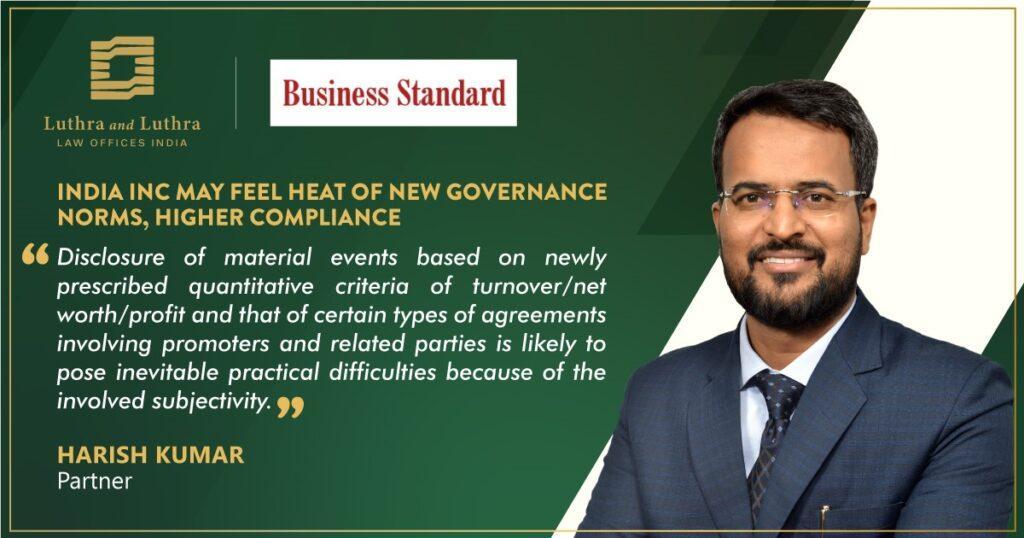 Partner, Harish Kumar was recently quoted in Business Standard. The article titled – “𝑰𝒏𝒅𝒊𝒂 𝑰𝒏𝒄 𝒎𝒂𝒚 𝒇𝒆𝒆𝒍 𝒉𝒆𝒂𝒕 𝒐𝒇 𝒏𝒆𝒘 𝒈𝒐𝒗𝒆𝒓𝒏𝒂𝒏𝒄𝒆 𝒏𝒐𝒓𝒎𝒔, 𝒉𝒊𝒈𝒉𝒆𝒓 𝒄𝒐𝒎𝒑𝒍𝒊𝒂𝒏𝒄𝒆” discusses the potential impact of new governance norms and increased compliance requirements on Indian businesses brought in by the Securities And Exchange Board of India