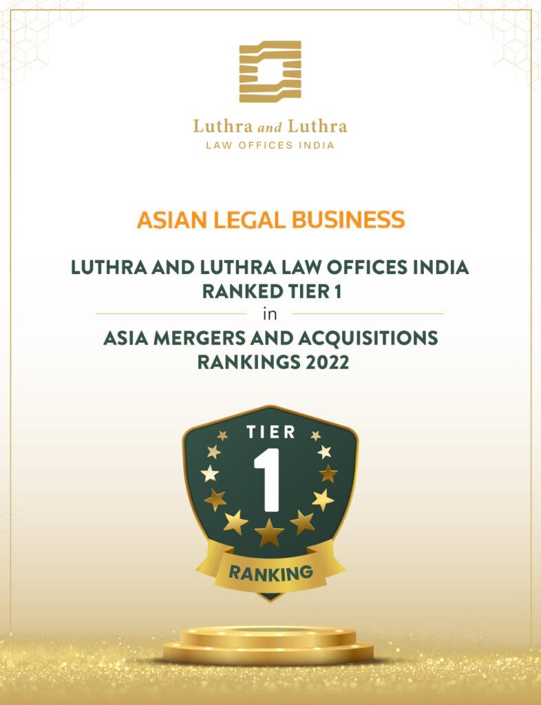 We are thrilled to announce that Luthra and Luthra Law Offices India has been ranked as a Tier 1 M&A Law Firm in India by Asian Legal Business in their recent Asia M&A Rankings 2022.As per the Annual Survey, the Firm stood out in India for the quality of work, size, profile of deals and clients.