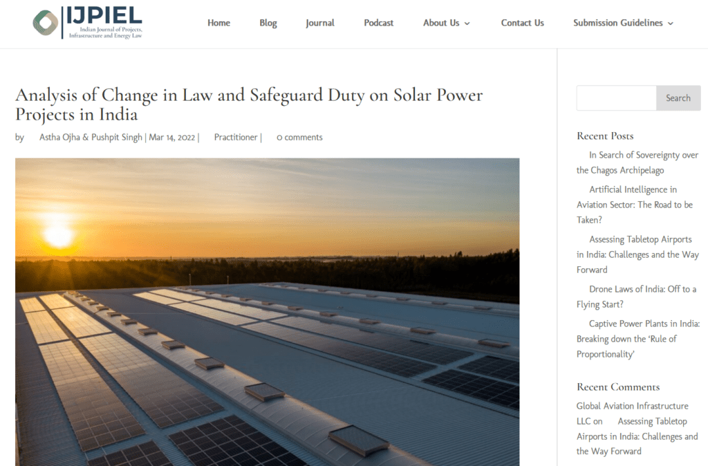Managing Associate, Astha Ojha has authored an article titled, “Analysis of Change in Law and Safeguard Duty on Solar Power Projects in India” published online ‘Indian Journal of Projects, Infrastructure, and Energy Law’