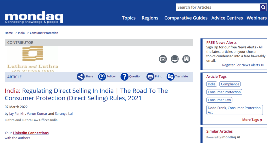 An article on ‘Regulating Direct Selling In India’ published by Mondaq, authored by Partner, Jay Parikh along with Managing Associate, Varun Kumar and Associate, Saranya Lal.