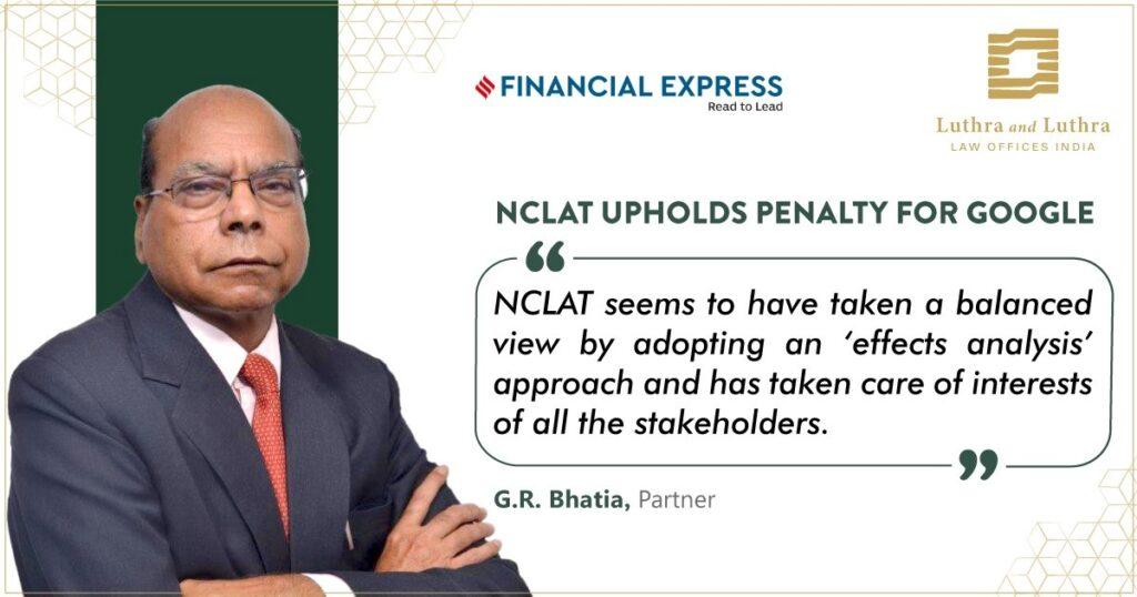 Partner, G R Bhatia shares with Financial Express (India) his expert views as The National Company Law Appellate Tribunal (NCLAT) upheld the INR 1,338-crore penalty imposed by the Competition Commission Of India (CCI) on Google.