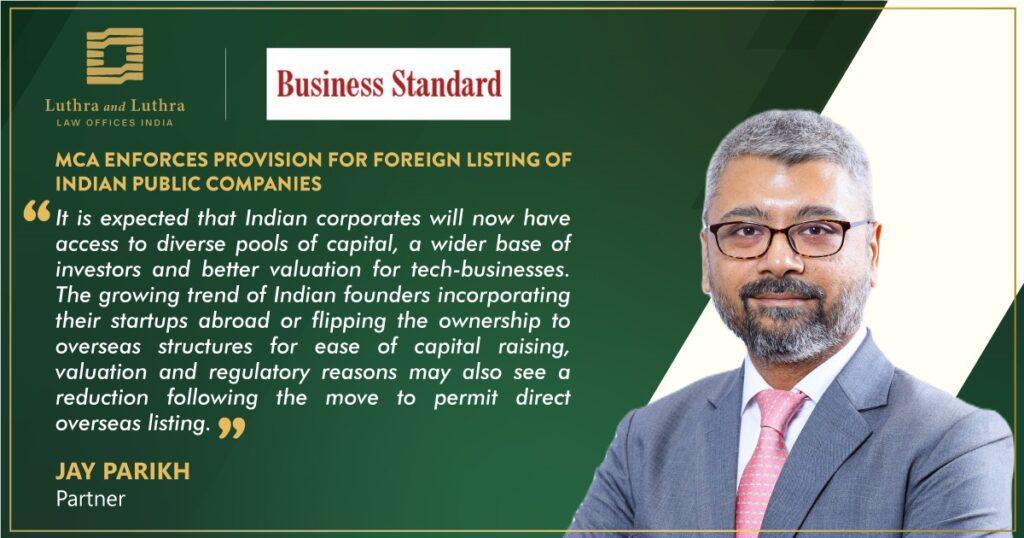 Partner, Jay Parikh shared his views with ‘Business Standard’ in an article titled, ‘MCA Enforces Provision For Foreign Listing Of Indian Public Companies’