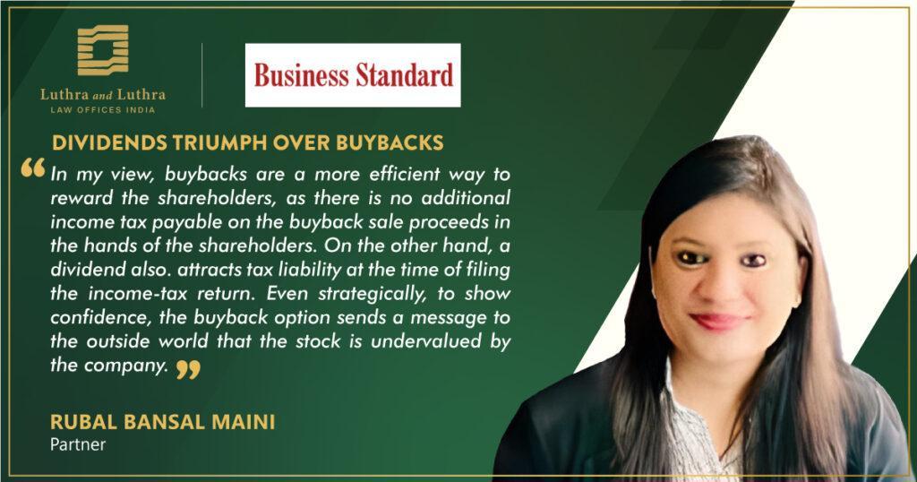 Partner, Rubal Bansal Maini was quoted in Business Standard in an article titled – ‘Dividends triumph over buybacks’ which talks aboutshare of buybacks in reward kitty dropping to lowest in seven years.