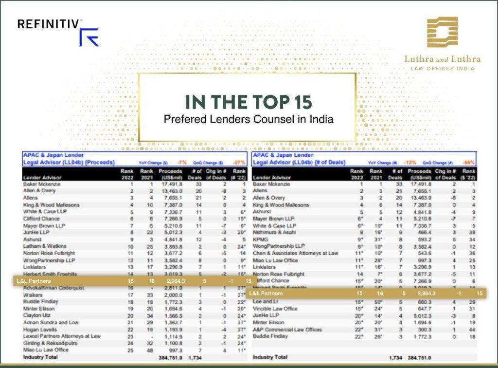 Ranked in the Top 15 Lenders Legal Counsel for the APAC and Japan region in Refinitiv, an LSEG business – 1H 2022 League Table rankings.