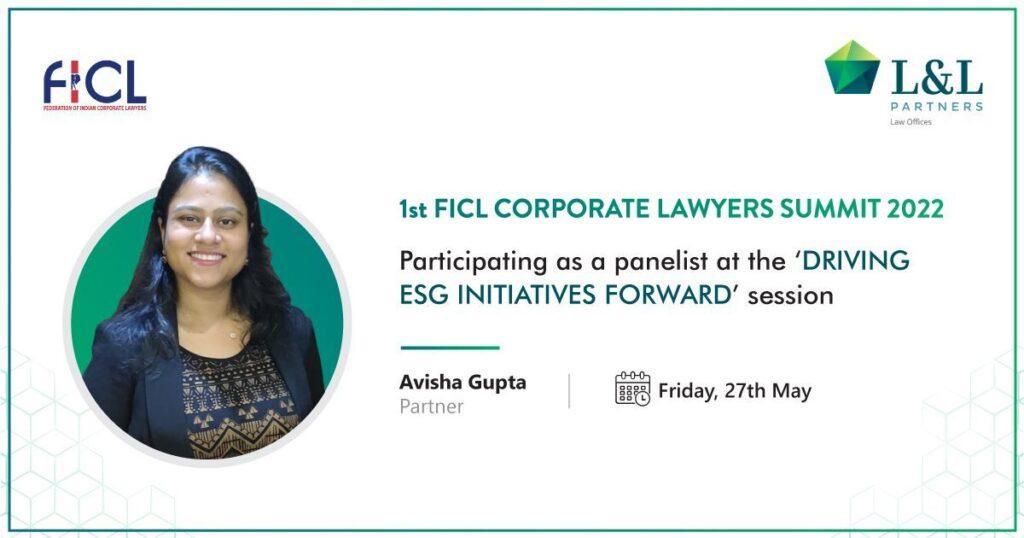 Avisha Gupta, partner, Luthra and Luthra Law Offices India will be participating as a panelist at the ‘Driving ESG Initiatives Forward’ session at the 1st FICL Corporate Lawyers Summit 2022 on 27th May 2022 at Taj Palace.