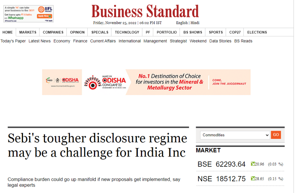 Partner, Harish Kumar was quoted in Business Standard in an article titled – ‘Tougher disclosure regime may be a challenge for India Inc’.